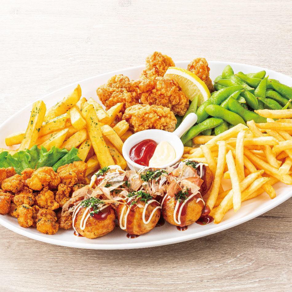감자 튀김 / 감자 튀김 / 타코야키 / 연골 튀김 맛 맛 / 완두콩 / 닭 튀김